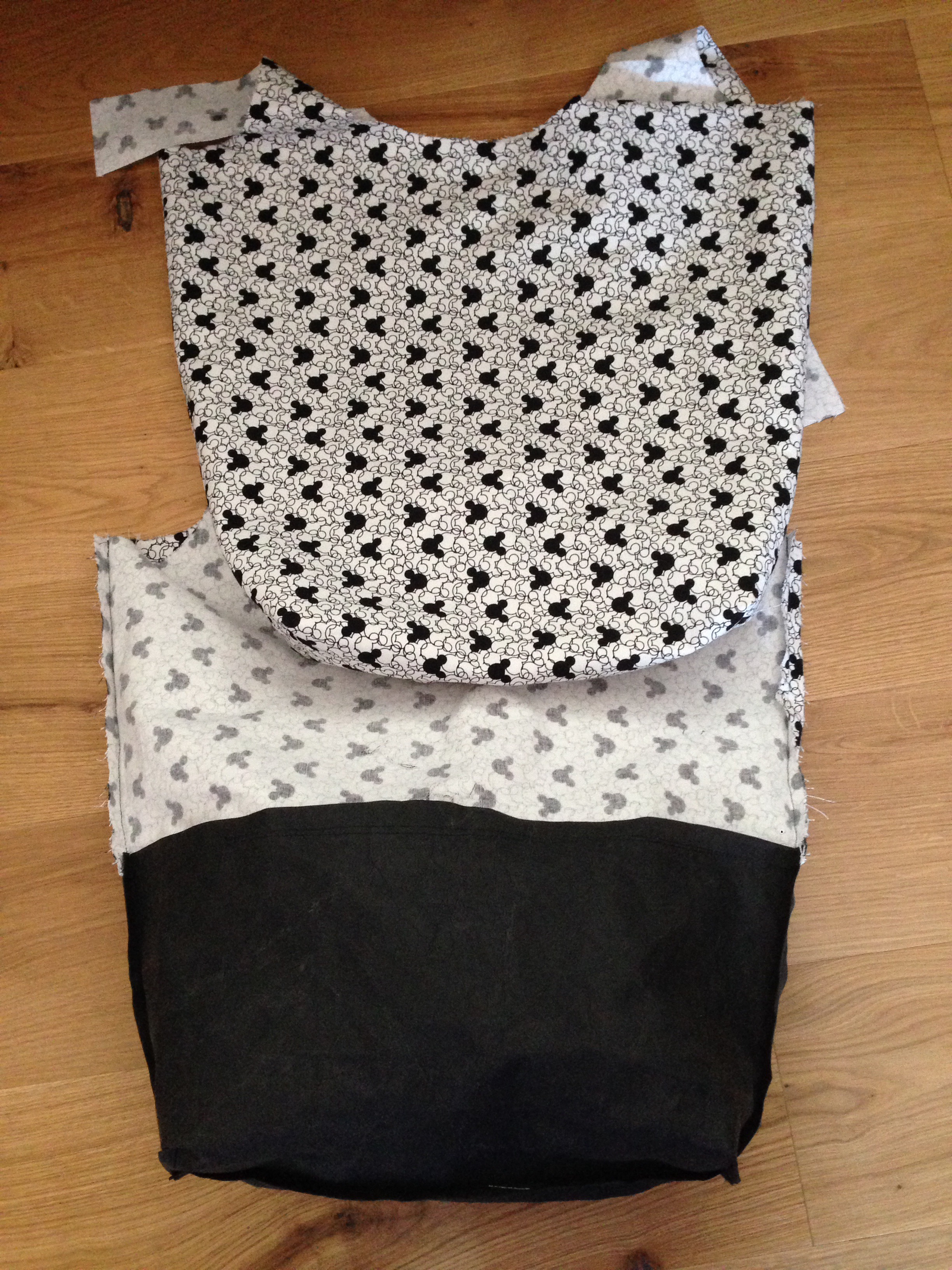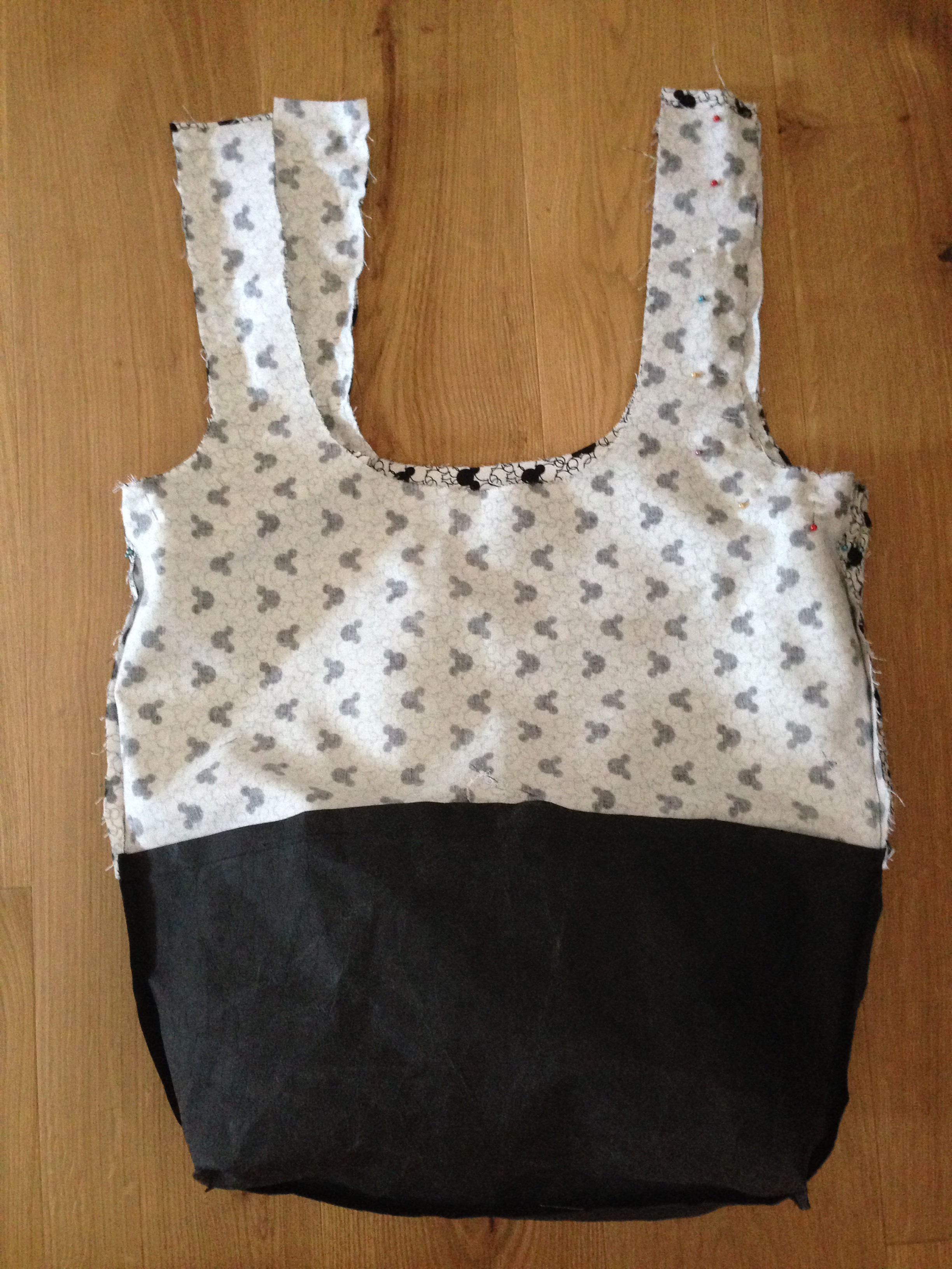 … beide Teile habe ich dann rechts auf rechts zusammengesteckt und an den Griffen und Kanten entlang gesteppt. Eine Kante habe ich offen gelassen damit ich das, doch noch ziemlich steife, SnapPap mit der restlichen Tasche auf die richtige Seite wenden kann…