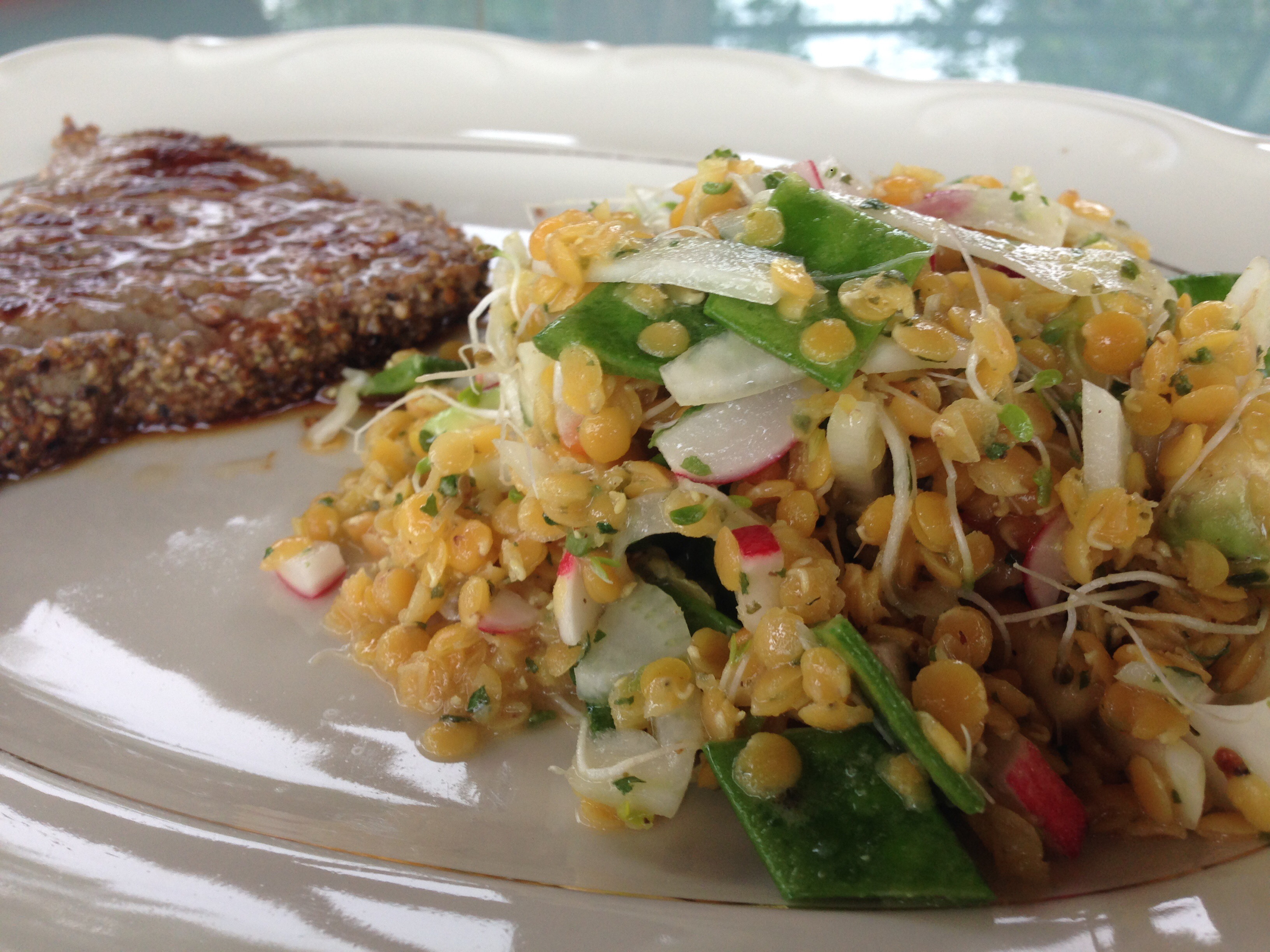 Eigentlich wollte ich ja einen „grüne Linsen“-Salat machen… aber auf der Packung der grünen Linsen stand: 1 – 2 Stunden einweichen und dann noch 30 Minuten köcheln…. Also schnell geht anders… Da fielen mir die orangenen Linsen in die Hände und da steht auf der Packung: unter fließendem Wasser gründlich waschen und 7 – 10 Minuten köcheln…. Aha…, geht doch 😜