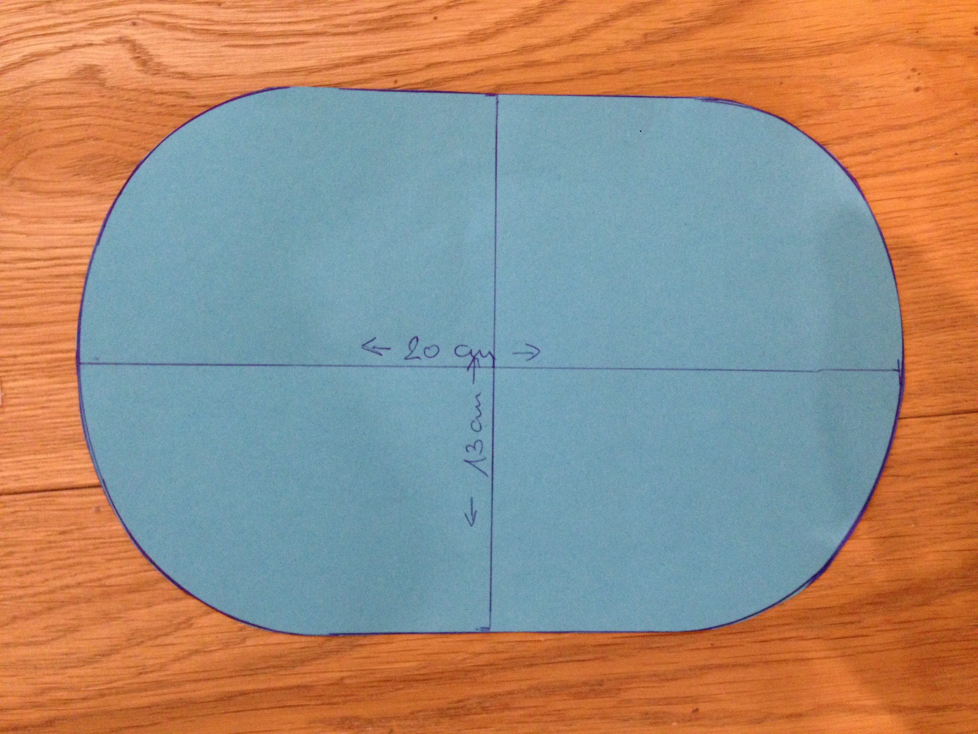 Zuerst habe ich mir eine Schablone gezeichnet. Ich habe in einer Hand ein A4 Blatt gefaltet, etwas aufgerundet, und entstanden sind die Maße 20 x 13 cm