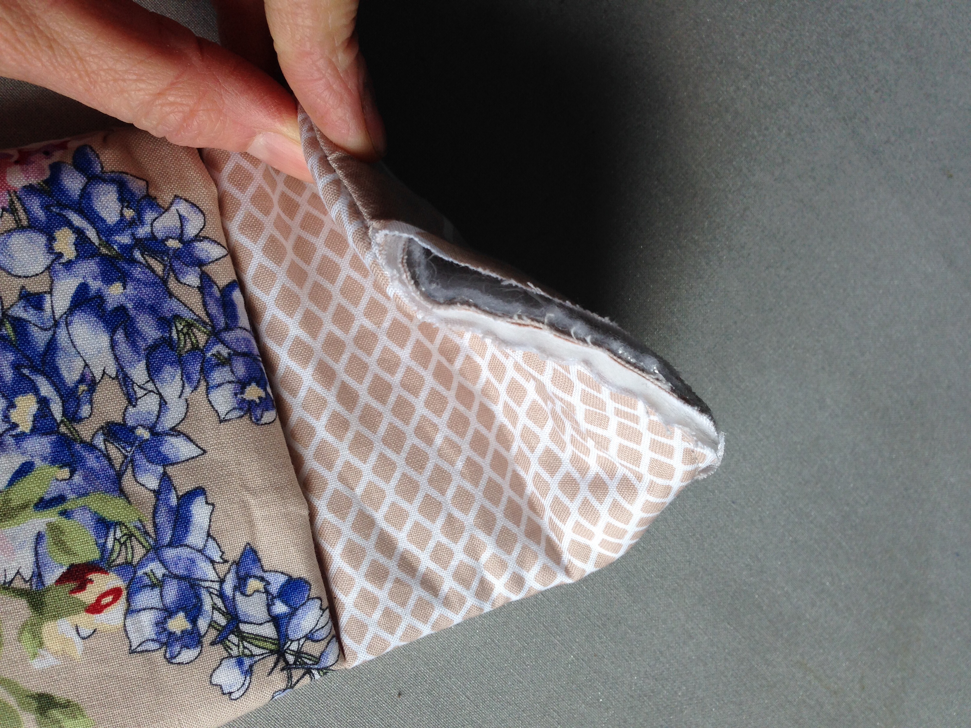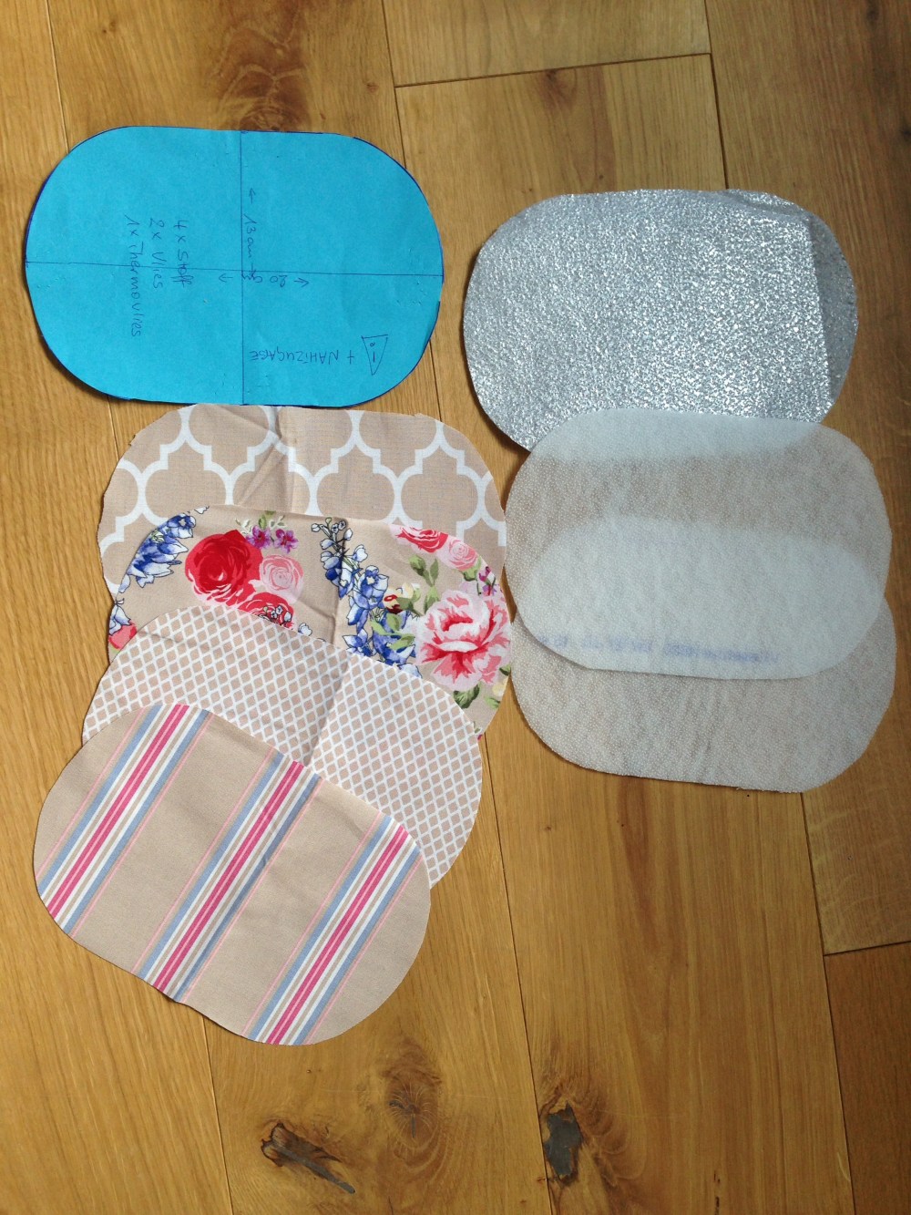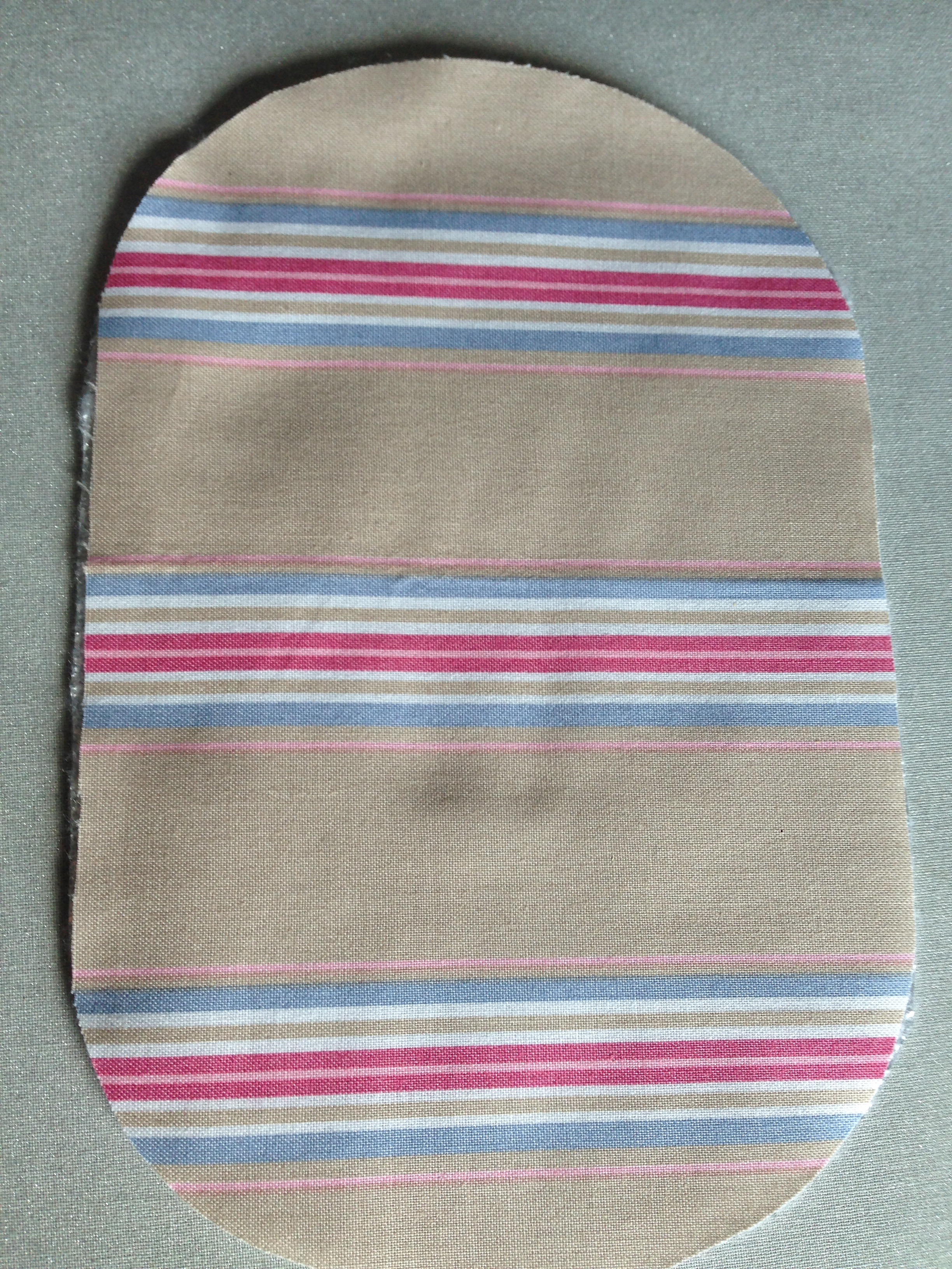 Mittels der Schablone 4 Lagen Stoff (1 x Außenstoff, 2x Einschubtaschen, 1 x Futterstoff) nach Wahl, 2 Lagen normales Vlies, 1 Lage Insul-Fleece zuschneiden