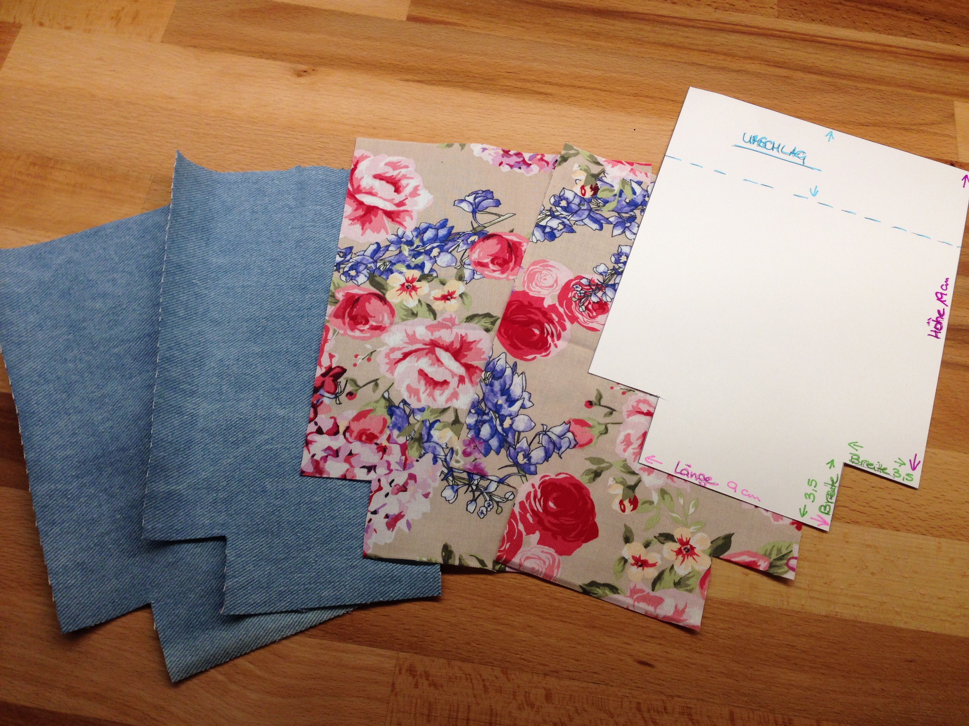 - Höhe = x + Umschlag + 2x1cm Nahtzugabe H:9+4+2=15cm