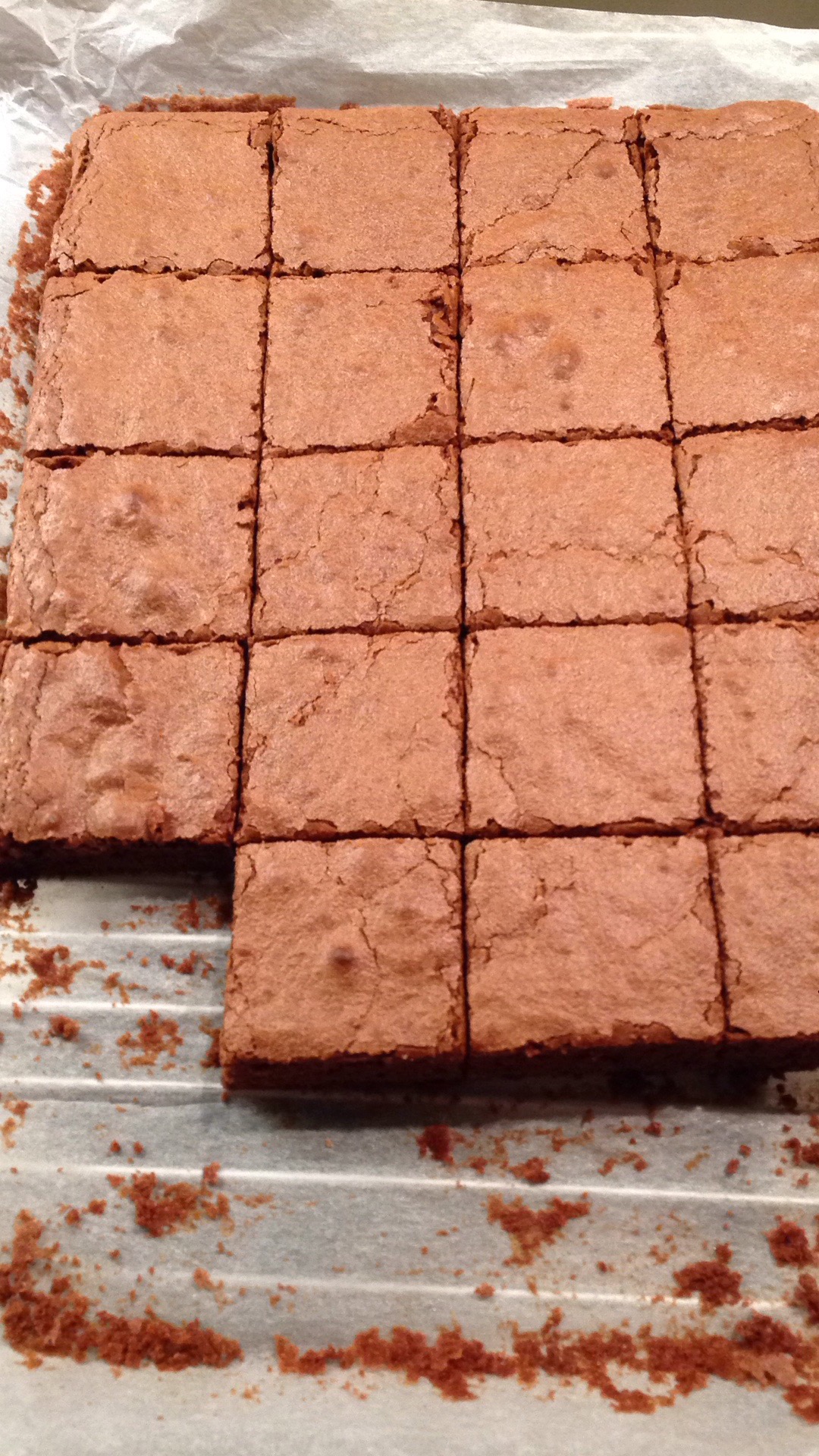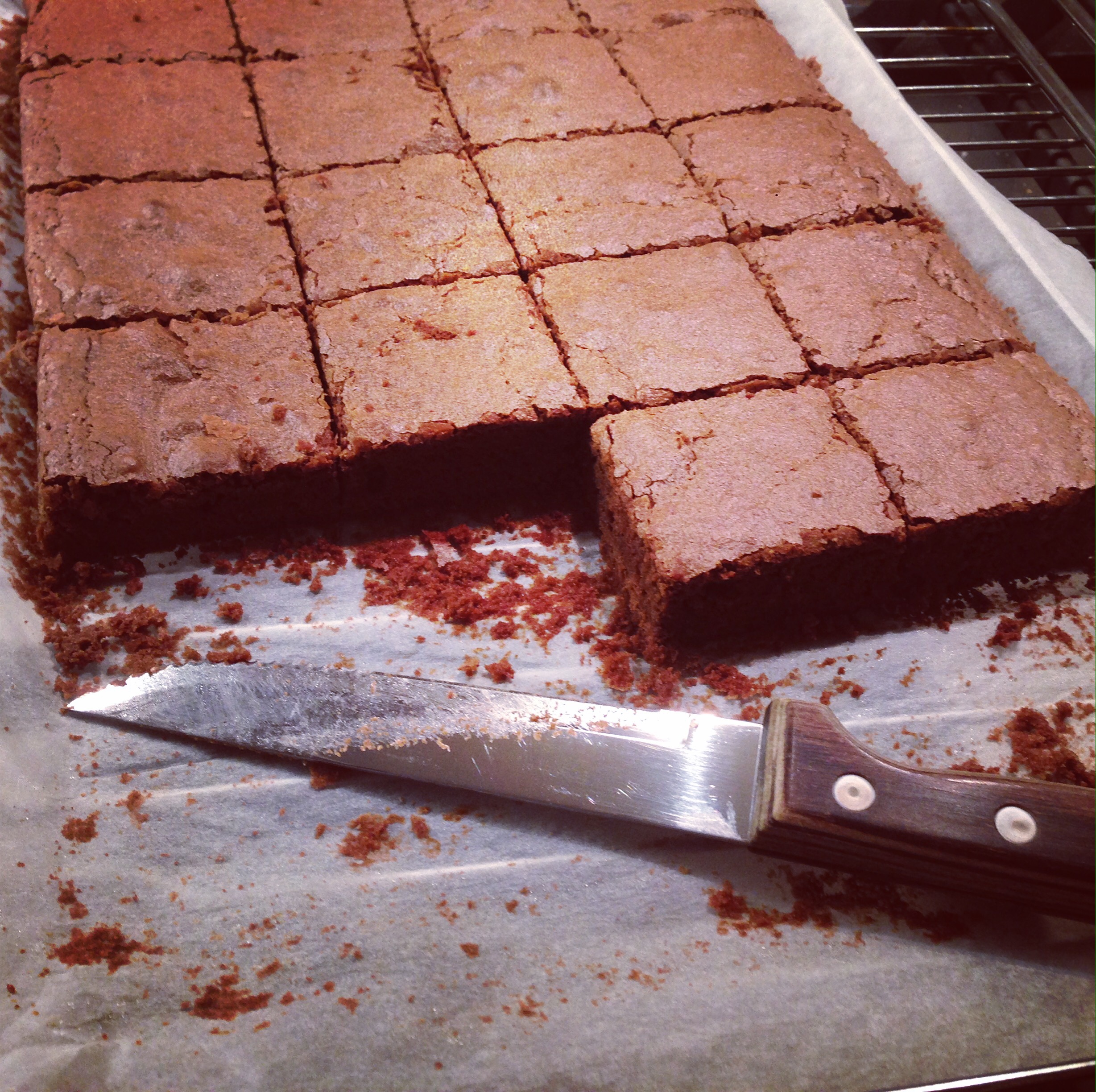 Den fertigen Teig 5 min in der Form ruhen lassen, dann mit dem Backpapier auf ein Gitter heben. Die Brownies auf die gewünschte Größe einschneiden, aber erst nach dem Abkühlen vorsichtig von dem Backpapier lösen, am Besten mit der Hilfe eines Messers.